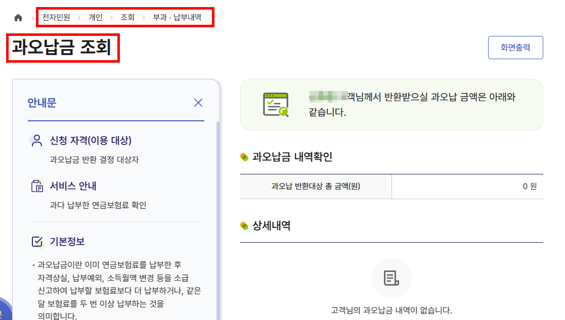 - 국민연금공단 홈페이지: 전자민원서비스(nps.or.kr) 접속 후 로그인하여 '개인민원' 메뉴에서 '보험료' 또는 '과오납금' 관련 메뉴를 찾아 조회할 수 있습니다.